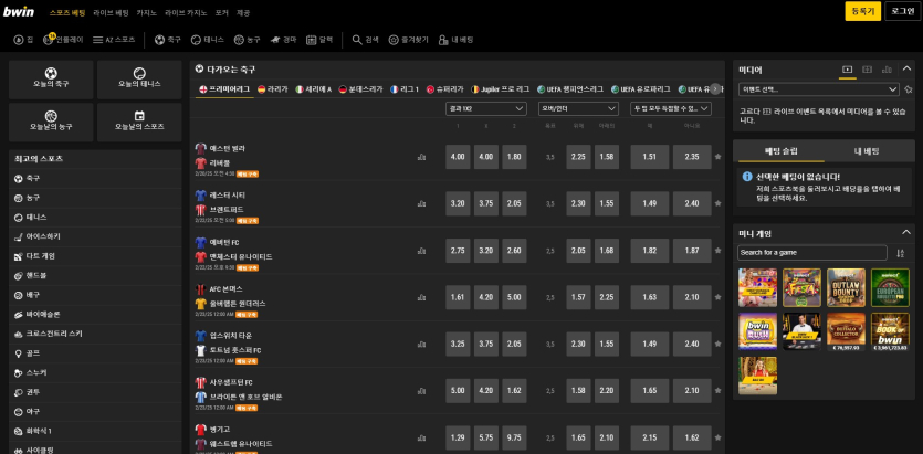 ◈ 평가:Bwin은 유럽 축구 팬들에게 특히 인기가 높은 사이트이며, 인터페이스가 깔끔하고 직관적입니다.