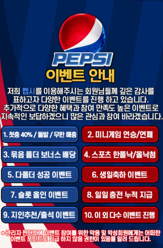 [펩시] ★ 미니게임 연승/연패,다폴더 성공,슬롯 올인,첫충40%,돌발,스포츠 한폴낙 이벤트 ★