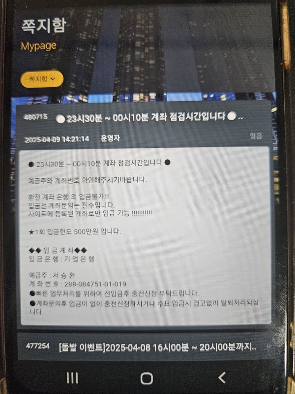 국야 끝나고 환전 누르니까 갑자기 '시스템 베팅'이라면서 원금만 돌려줌. 처음엔 뭔 소린가 했지. 물어보니까 담당자는 입 꾹 다물고 말도 못 해. 뭔가 설명이라도 하겠지 했는데, 씨… 걍 벙쪘음.