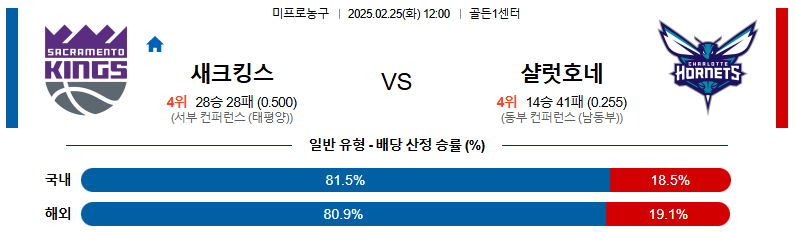 [벳조이 스포츠 분석]02일 25일 12:00 NBA 새크라멘토 킹스 샬럿 호네츠