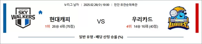 2025년 2월 26일 현대캐피탈과 우리카드의 경기는 현대캐피탈의 승리가 유력하며,