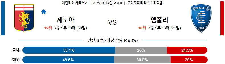 [벳조이 스포츠 분석]03월 02일 23:00 세리에 A 제노아 CFC 엠폴리