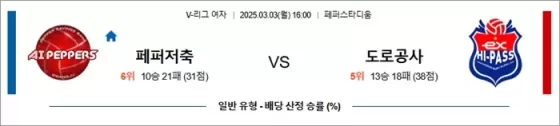예측 결과: 페퍼저축이 홈 경기에서 도로공사를 상대로 우세할 것으로 보입니다.