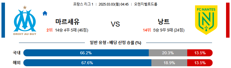 [벳조이 스포츠 분석]03월 03일 04:45 리그앙 올림피크 마르세유 FC 낭트