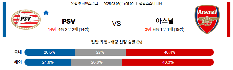 [벳조이 스포츠 분석]03월05일 PSV:아스날 UEFA챔피언스리그 분석 및 예측