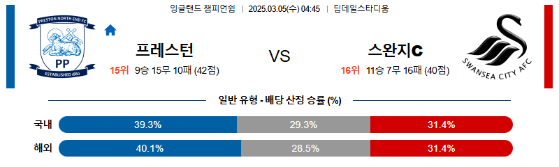 [벳조이 스포츠 분석]03월05일 프레스턴:스완지시티 잉글랜드챔피언쉽 분석 및 예측