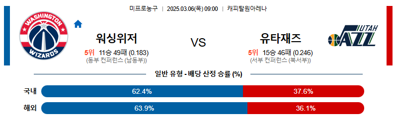 [벳조이 스포츠 분석]03월06일 워싱턴:유타 NBA 분석 및 예측
