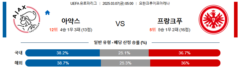 [벳조이 스포츠 분석]03월07일 아약스:프랑크 UEFA유로파리그 분석 및 예측