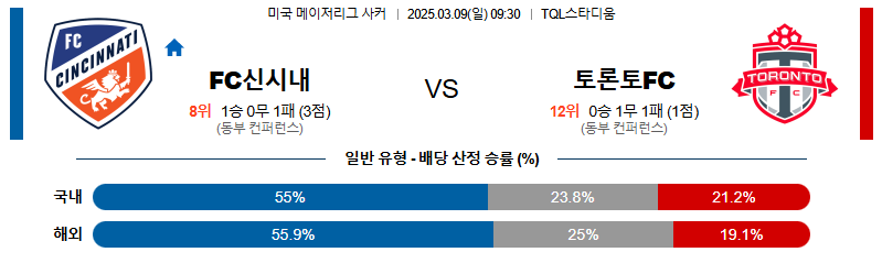 FC 신시내티는 시즌 개막전에서 뉴욕 레드불스를 상대로 1-0 승리를 거두며 좋은 출발을 보였습니다. 그러나 지난 경기에서는 필라델피아 유니언에게 1-4로 대패하며 수비 불안을 드러냈습니다. 특히 원정 경기에서 수비 조직력이 흔들리는 모습을 보였고, 최근 리그 원정 3경기 연속 다실점을 기록하고 있습니다. 다만, 홈에서는 비교적 안정적인 모습을 보이며 이번 시즌 모든 대회를 포함해 3경기 연속 무패 행진을 이어가고 있습니다. 또한, 홈에서 토론토를 상대로 단 한 골도 허용하지 않고 전승을 거두고 있어 심리적 우위를 갖고 경기에 나설 것으로 보입니다.