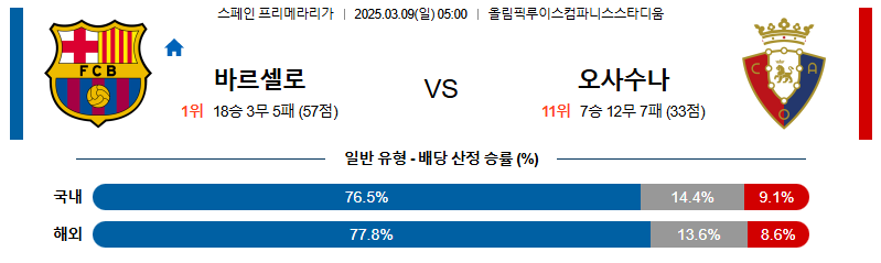 [벳조이 스포츠 분석]03월09일 바르셀로나:오사수나 라리가 분석 및 예측