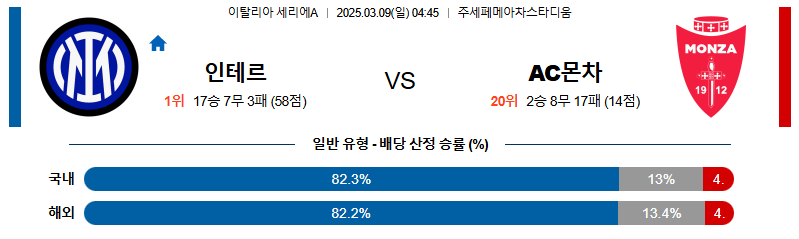 [벳조이 스포츠 분석]03월09일 인테르:몬차 세리에A 분석 및 예측