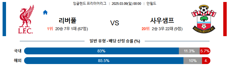 [벳조이 스포츠 분석]03월09일 리버풀:사우샘프턴 프리미어리그 분석 및 예측