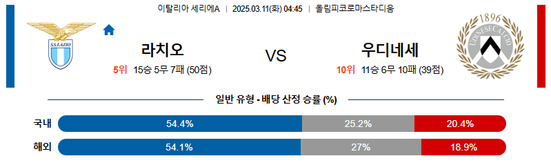 [벳조이 스포츠 분석]03월11일 라치오:우디네세 세리에A 분석 및 예측