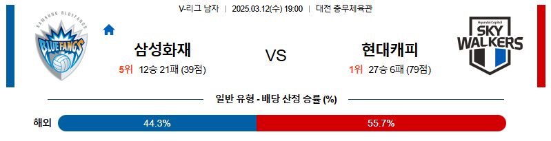 [벳조이 스포츠 분석]03월12일 삼성화재:현대캐피탈 V리그 분석 및 예측
