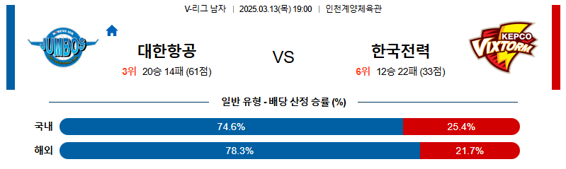 [벳조이 스포츠 분석]03월13일 대한항공:한국전력 V리그 분석 및 예측