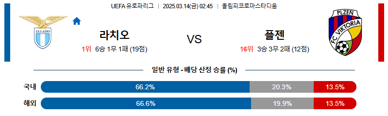 [벳조이 스포츠 분석]03월14일 라치오:플젠 UEFA유로파리그 분석 및 예측