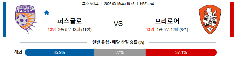[벳조이 스포츠 분석]03월15일 퍼스글로리:브리즈번 호주A리그 분석 및 예측