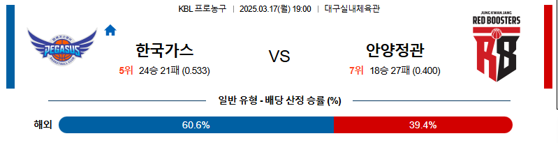 [벳조이 스포츠 분석]03월17일 대구한국가스:안양정관장 KBL 분석 및 예측