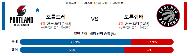 [벳조이 스포츠 분석]03월17일 포틀랜드:토론토 NBA 분석 및 예측