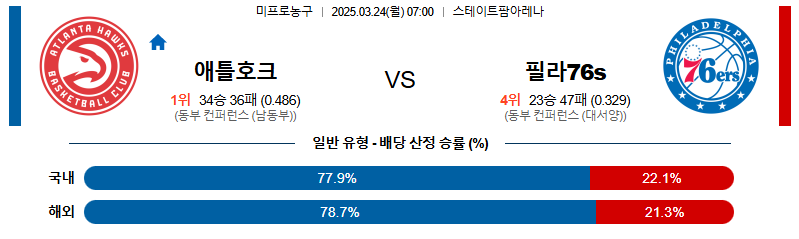 [벳조이 스포츠 분석]03월24일 애틀랜타:필라델피아 NBA 분석 및 예측