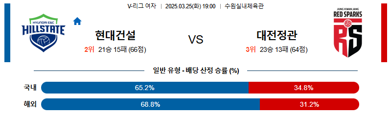 [벳조이 스포츠 분석]03월25일 현대건설:정관장 V리그(여) 분석 및 예측
