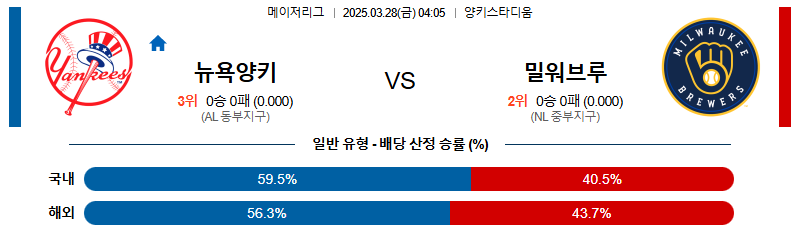 [벳조이 스포츠 분석]03월28일 뉴욕양키스:밀워키 MLB 분석 및 예측