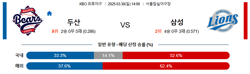 [벳조이 스포츠 분석]03월30일 두산:삼성 KBO 분석 및 예측