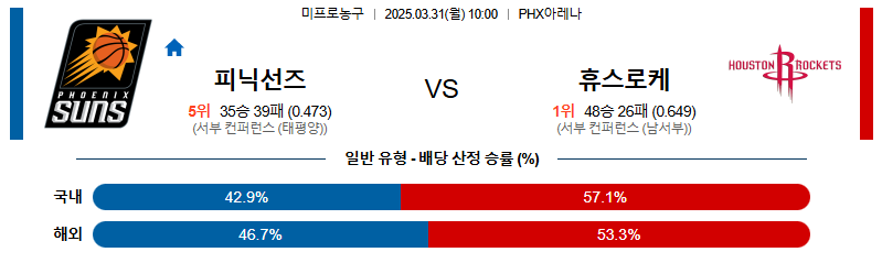 [벳조이 스포츠 분석]03월31일 피닉스:휴스턴 NBA 분석 및 예측