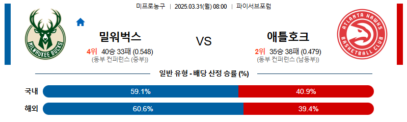 [벳조이 스포츠 분석]03월31일 밀워키:애틀란타 NBA 분석 및 예측