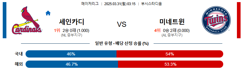 [벳조이 스포츠 분석]03월31일 세인트루이스:미네소타 MLB 분석 및 예측