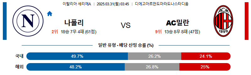 [벳조이 스포츠 분석]03월31일 나폴리:AC밀란 세리에A 분석 및 예측
