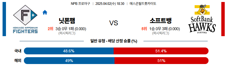 [벳조이 스포츠 분석]04월02일 니혼햄:소프트뱅크 NPB 분석 및 예측