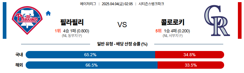 [벳조이 스포츠 분석]04월04일 필라델피아:콜로라도 MLB 분석 및 예측