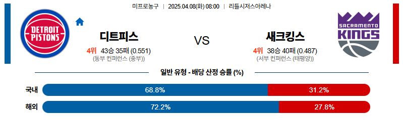 [벳조이 스포츠 분석]04월08일 디트로이트:새크라멘토 NBA 분석 및 예측