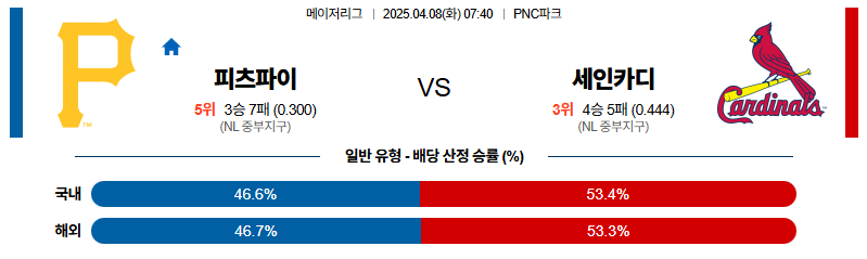 [벳조이 스포츠 분석]04월08일 피츠버그:세인트루이스 MLB 분석 및 예측