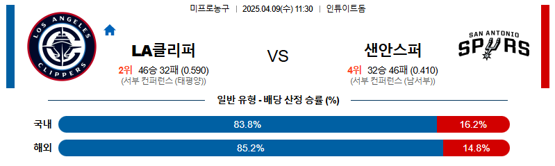[벳조이 스포츠 분석]04월09일 LA클리퍼스:샌안토니오 NBA 분석 및 예측