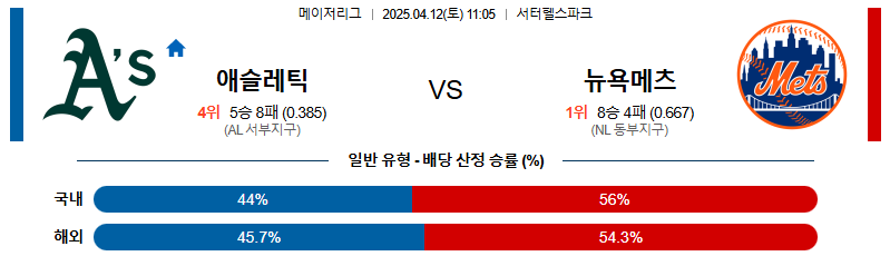 [벳조이 스포츠 분석]04월12일 애슬레틱스:뉴욕메츠 MLB 분석 및 예측