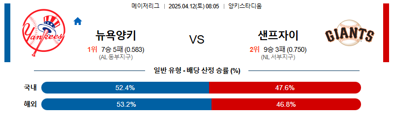 [벳조이 스포츠 분석]04월12일 뉴욕양키스:샌프란시스코 MLB 분석 및 예측