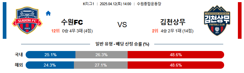 [벳조이 스포츠 분석]04월12일 수원FC:김천상무 K리그1 분석 및 예측