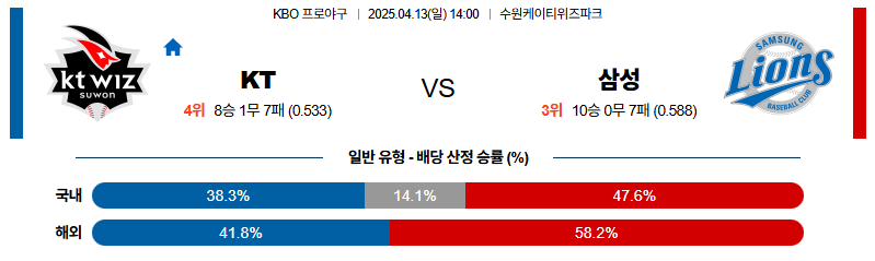 [벳조이 스포츠 분석]04월13일 KT:삼성 KBO 분석 및 예측