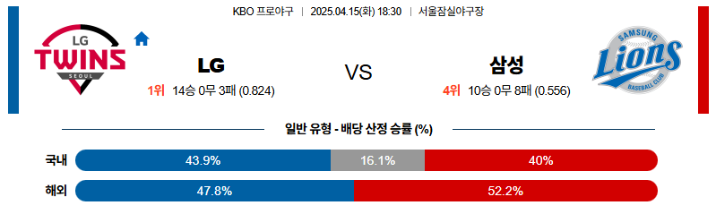 [벳조이 스포츠 분석]04월15일 LG:삼성 KBO 분석 및 예측