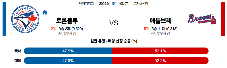 [벳조이 스포츠 분석]04월16일 토론토:애틀랜타 MLB 분석 및 예측