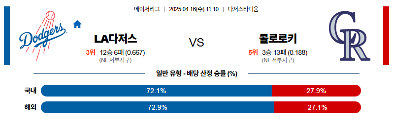[벳조이 스포츠 분석]04월16일 LA다저스:콜로라도 MLB 분석 및 예측