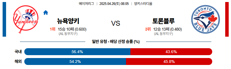 [벳조이 스포츠 분석]04월26일 뉴욕양키스:토론토 MLB 분석 및 예측
