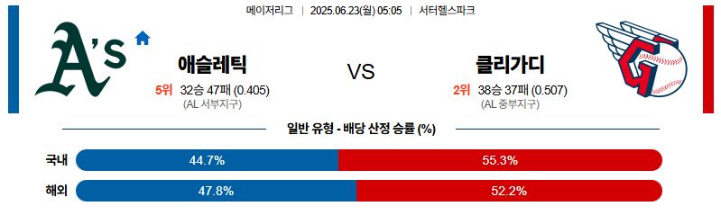 [벳조이 스포츠 분석]06월23일 애슬레틱스:클리블랜드 MLB 분석 및 예측 스포츠중계:스포츠무료중계