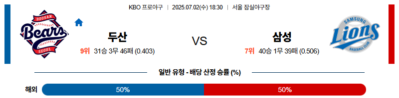 [벳조이 스포츠 분석]07월02일 두산:삼성 KBO 분석 및 예측 스포츠중계:스포츠무료중계