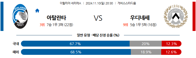 [벳조이]11월 10일 아탈란타 BC vs 우디네세 칼초 【세리에A】