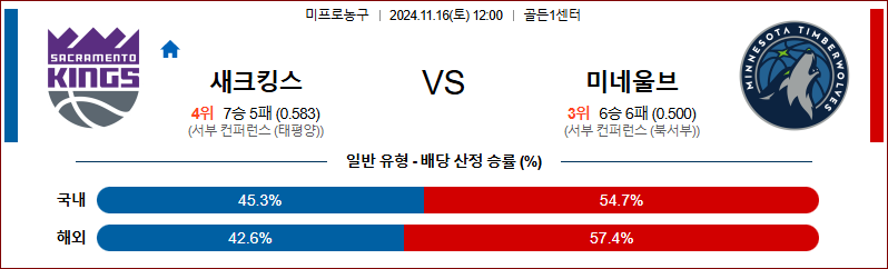 [벳조이]11월 16일 새크라멘토 vs 미네소타 【NBA】