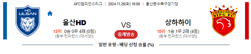 [벳조이]11월 26일 울산HD vs 상하이 하이강 【AFC챔피언스리그】