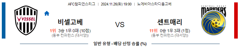 [벳조이]11월 26일 비셀 고베 vs 센트럴 코스트 마리너스 FC 【AFC챔피언스리그】